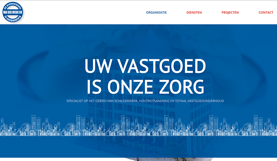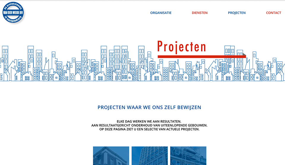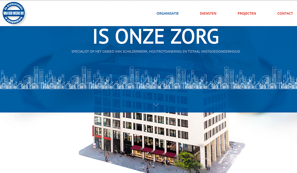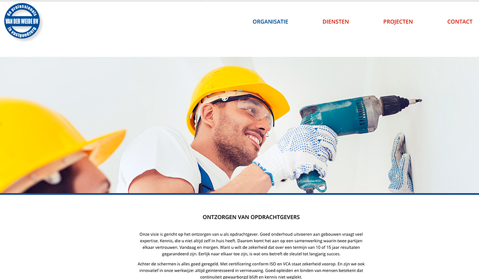 De website geeft een goed beeld van de diensten die Van der Weide B.V. levert. Opzet van de site is als ‘one pager’ wel met extra pagina’s op een tweede niveau waar meer uitleg wordt gegeven.